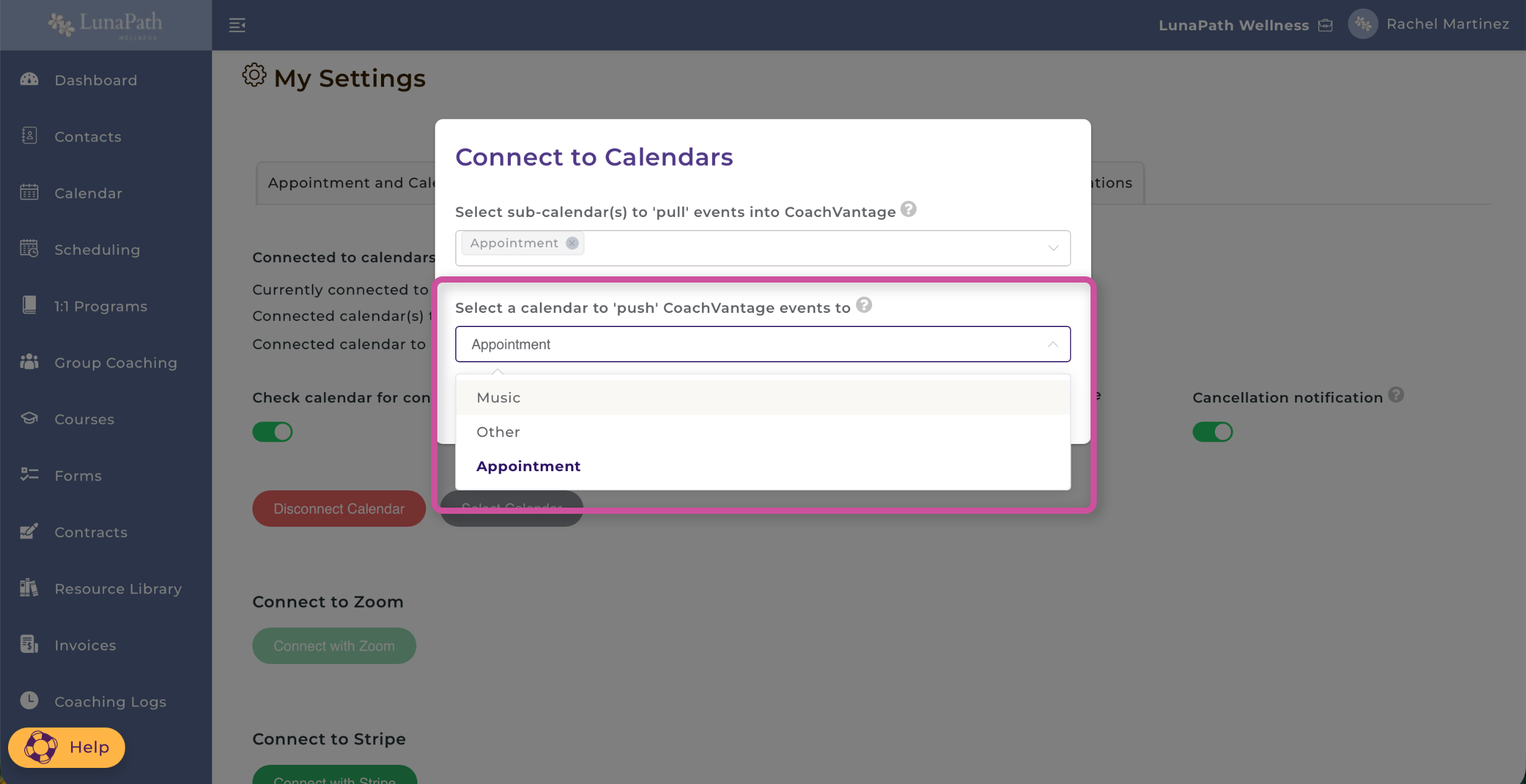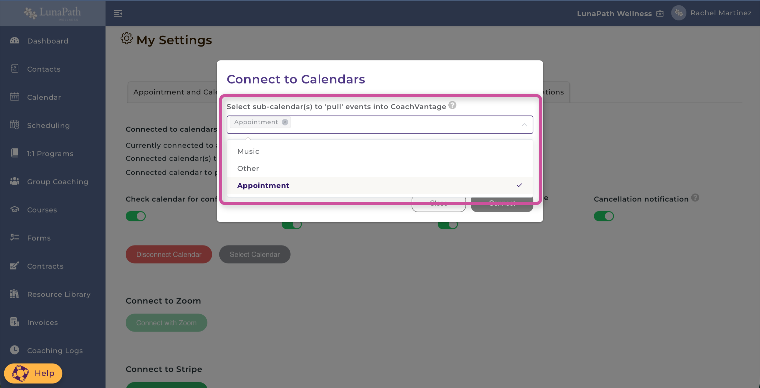 5. Choose which sub-calendars to connect with. You can select multiple sub-calendars to 'pull' events into your CoachVantage calendar. You can select only one calendar to 'push' events from your CoachVantage calendar to your external calendar.