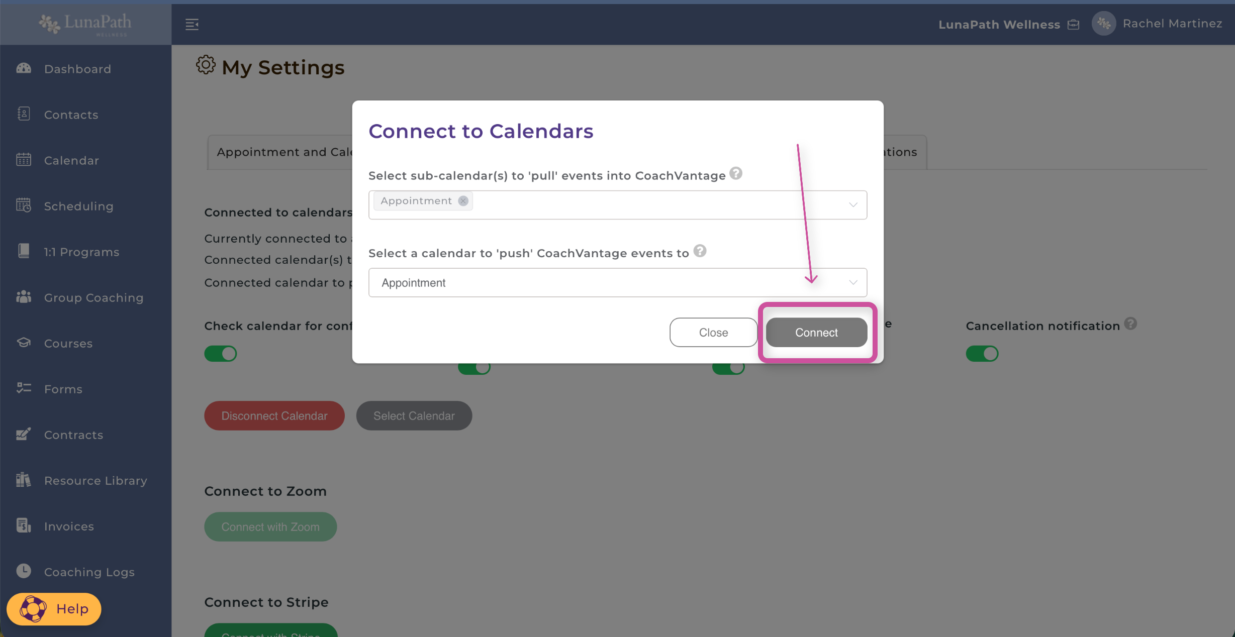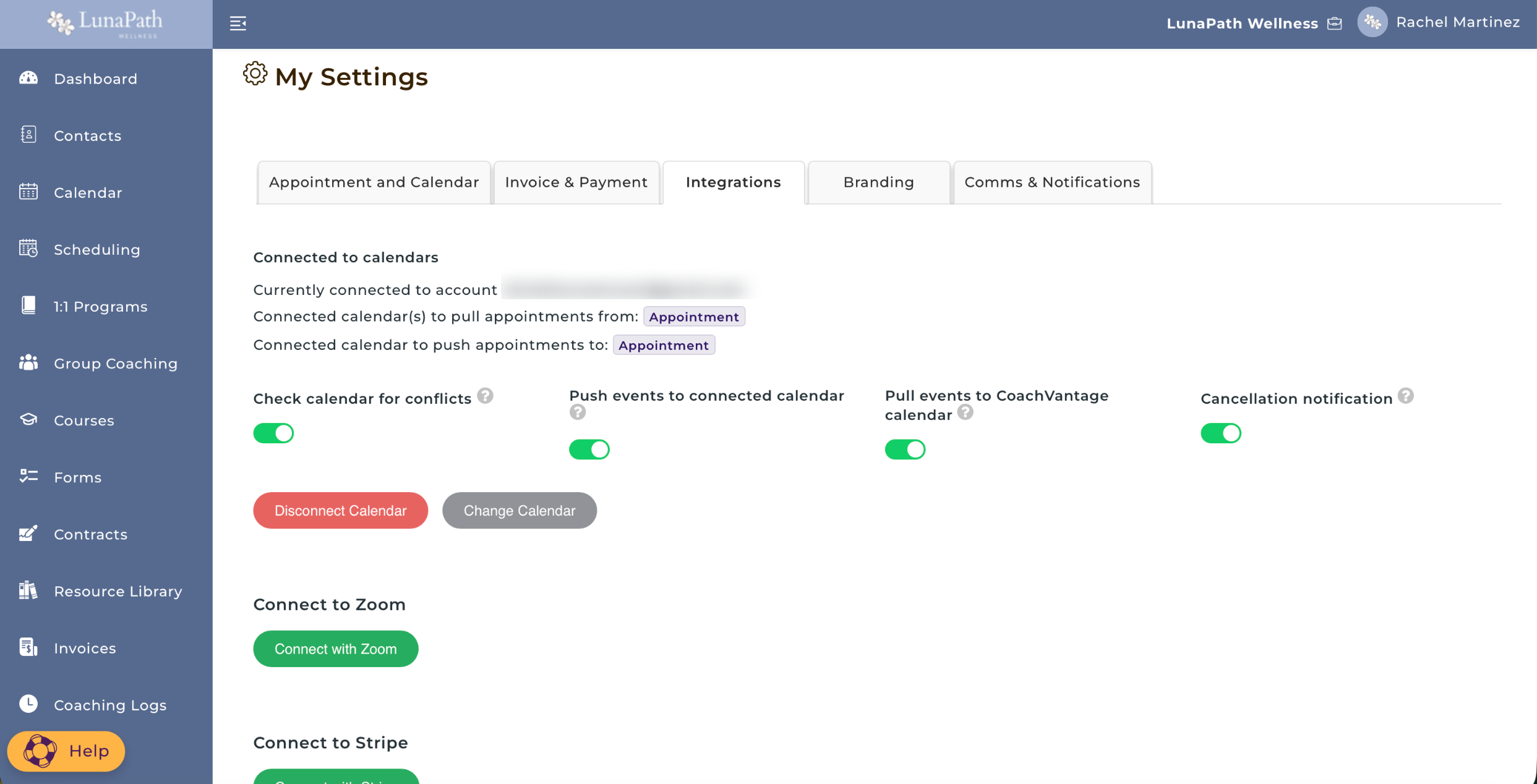 Once your calendar is connected, CoachVantage will display which calendar(s) you are connected to.