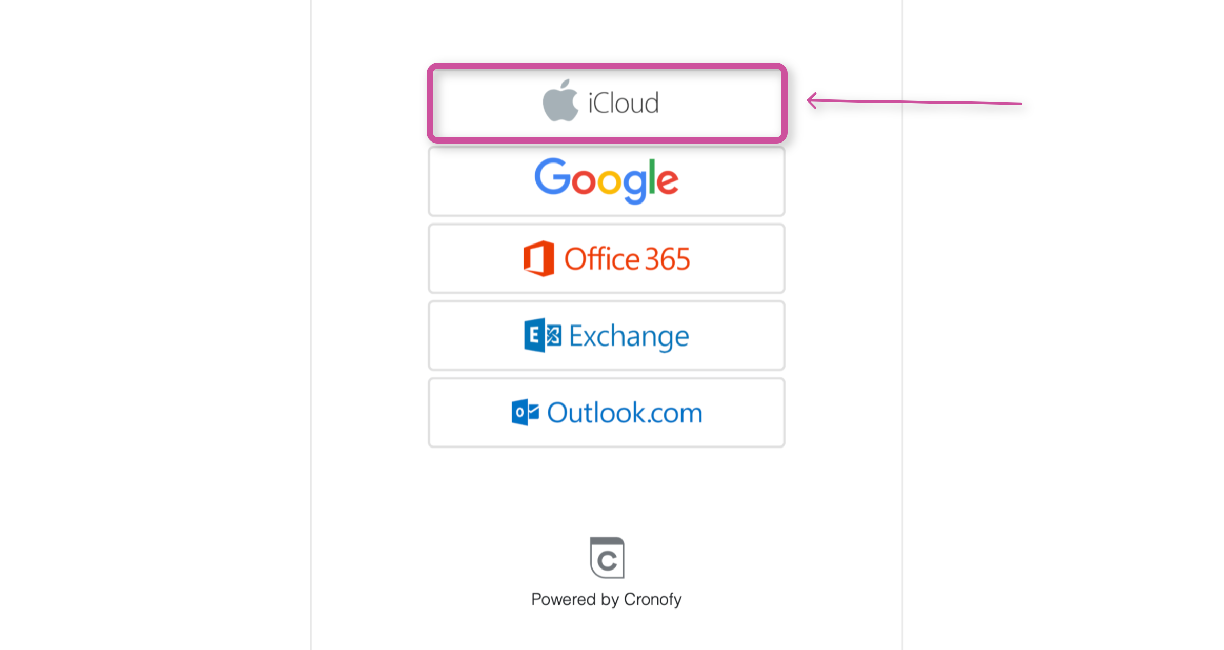 2. Select the external Calendar application that you would like to sync to. Supported calendars are iCloud, Google, Office 365, Exchange and Outlook.com.