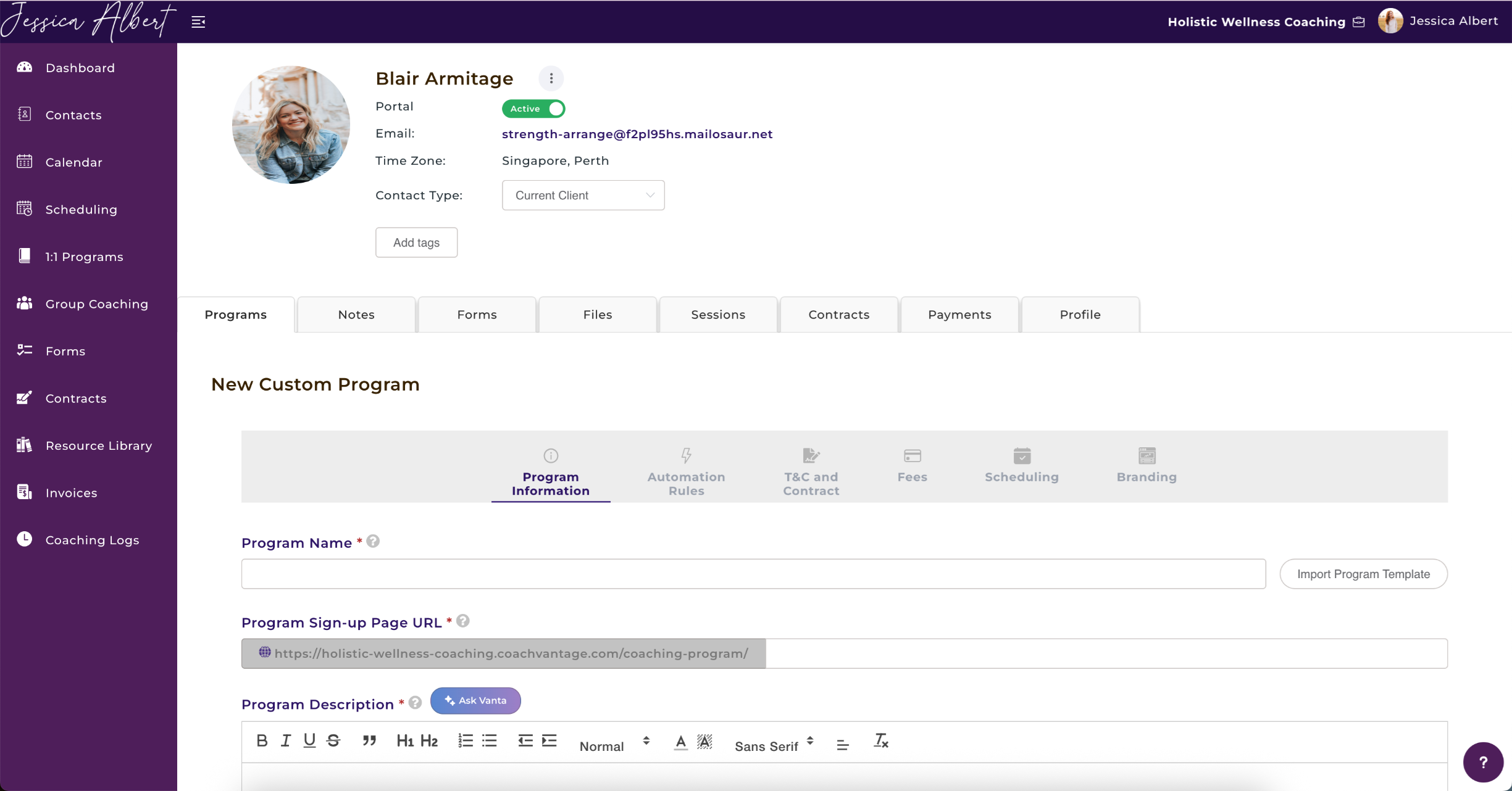 - The New Custom Program page will open on the client's individual contact record page.