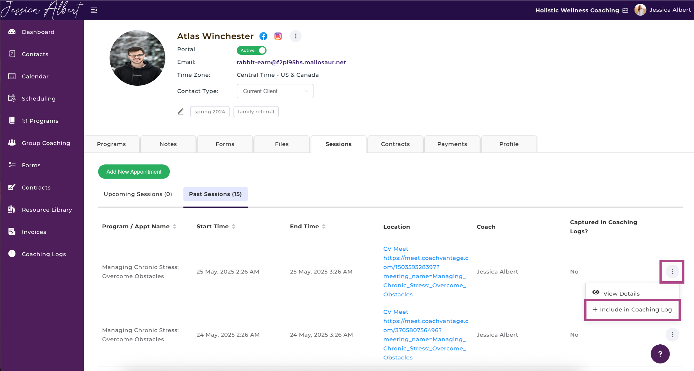 If you'd like to capture the coaching time for a session in the coaching log, click on the 3-dot button menu and select + Include in Coaching Log as shown below.