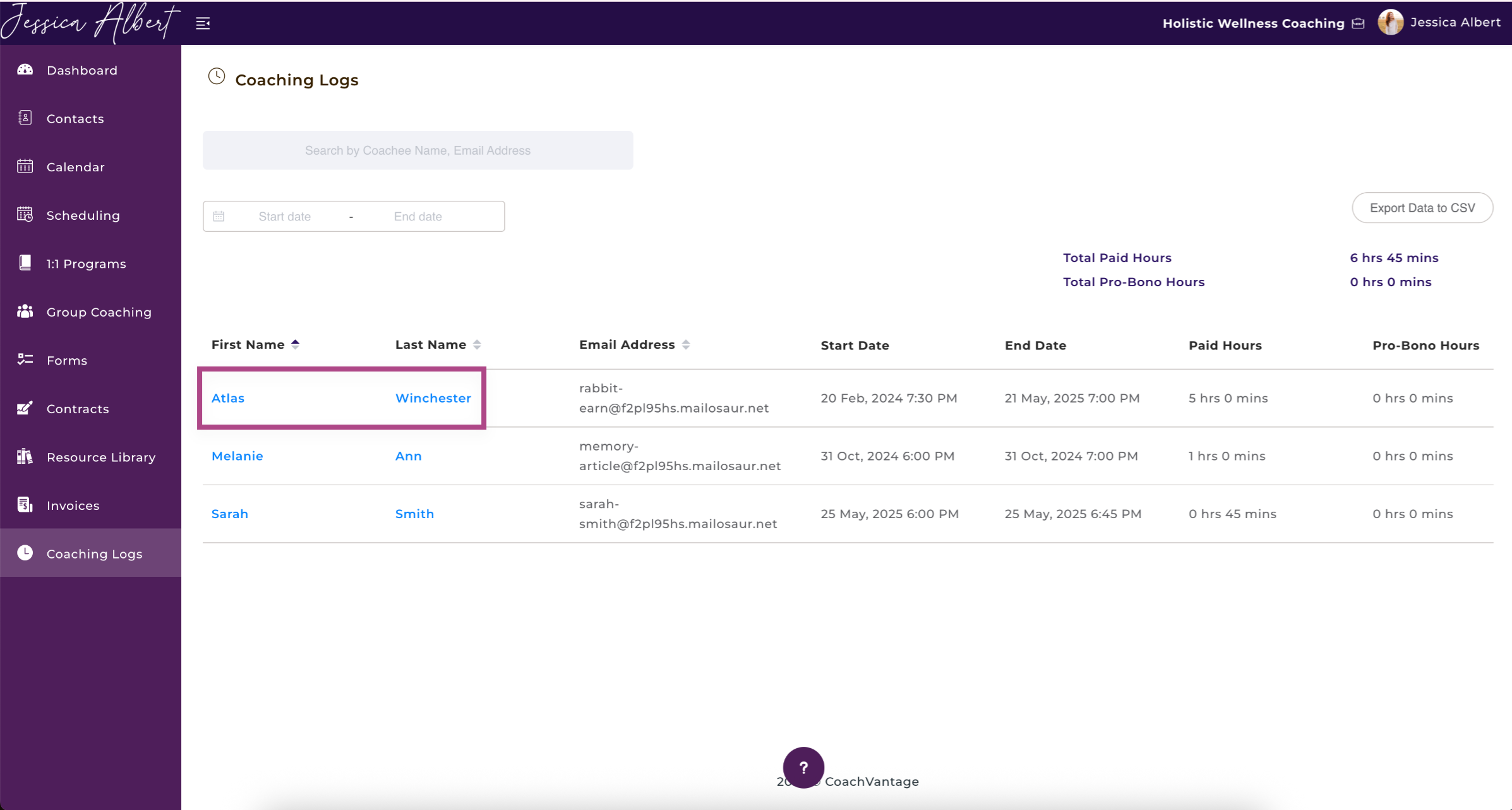 Tip: Another way to easily access a contact's Individual Contact Record is by clicking on their name while on the Coaching Logs Page as shown below: