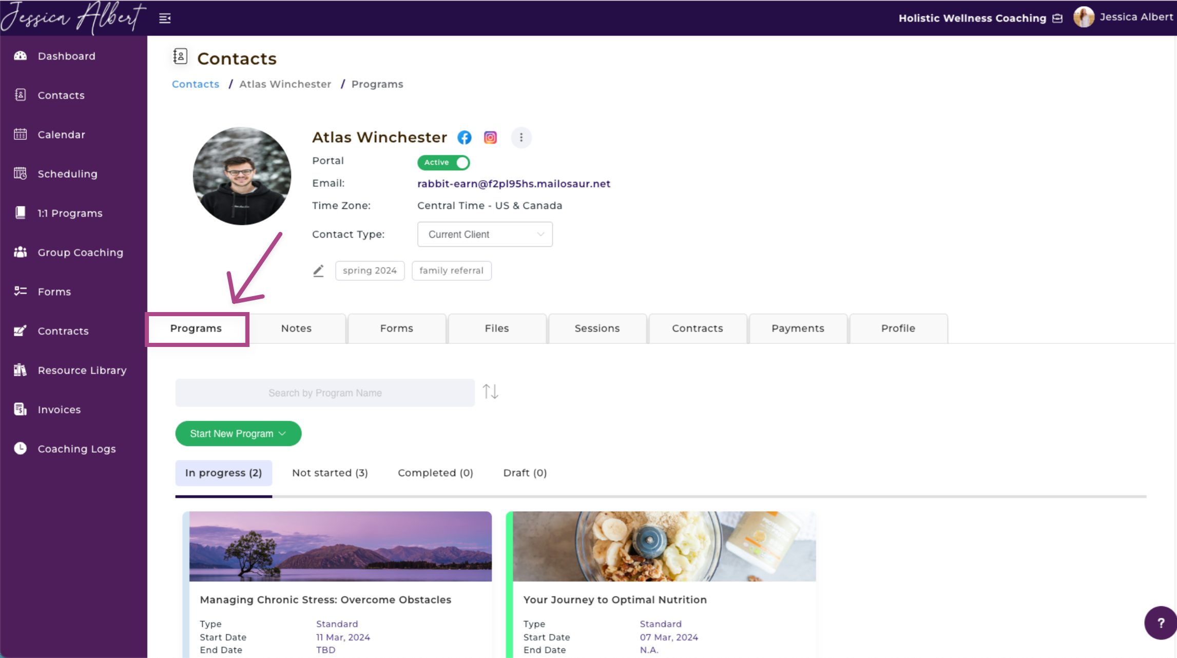 The Programs tab on an individual contact record page is where you can invite or enroll your contact into your coaching programs.