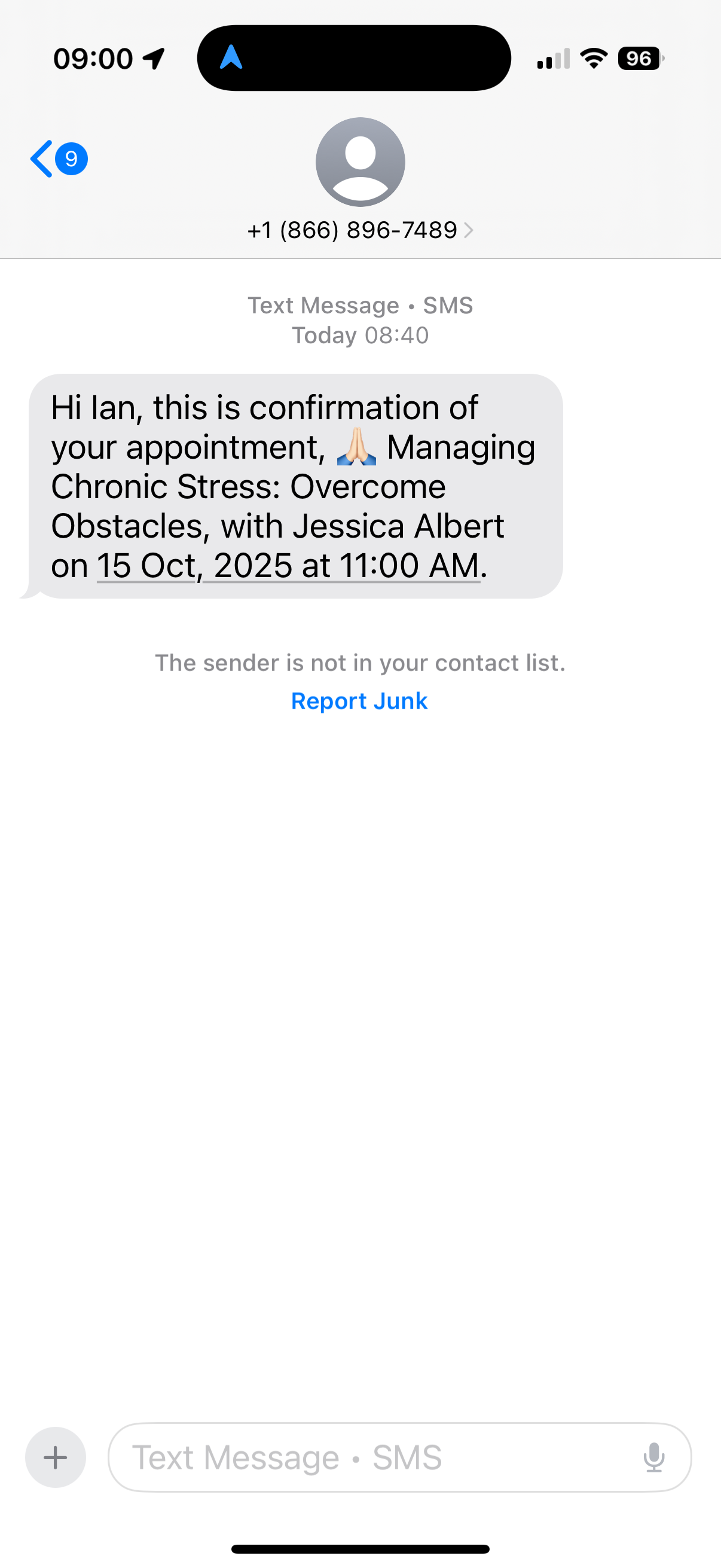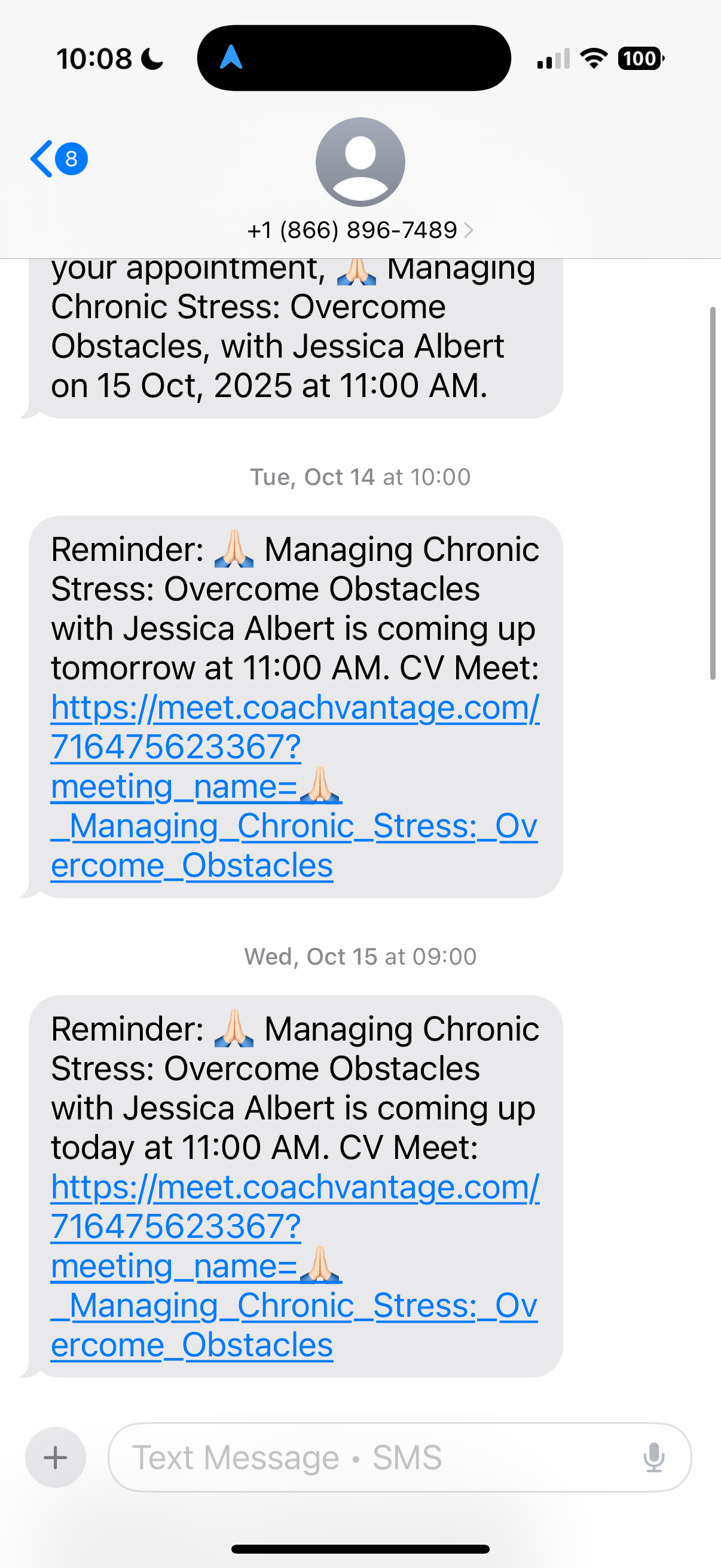 If you configure SMS reminders to send to clients ahead of the appointment, the client will receive SMS messages that look like this: